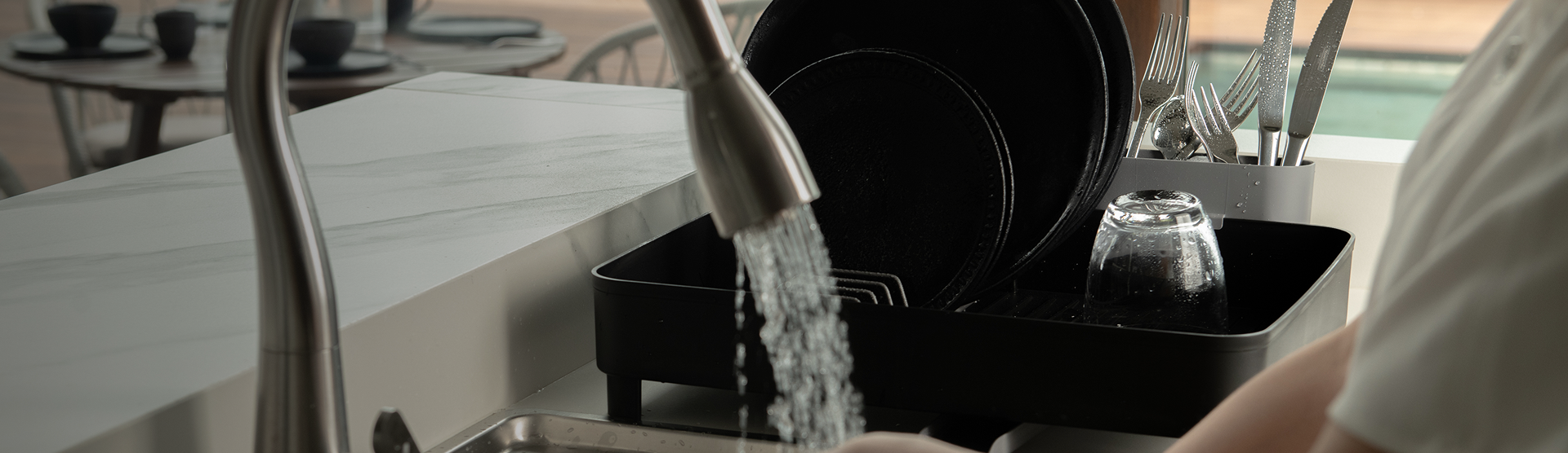 A limpeza regular com água e sabão neutro e a retirada da água acumulada na base ajudam a manter o escorredor limpo e pronto para o uso.