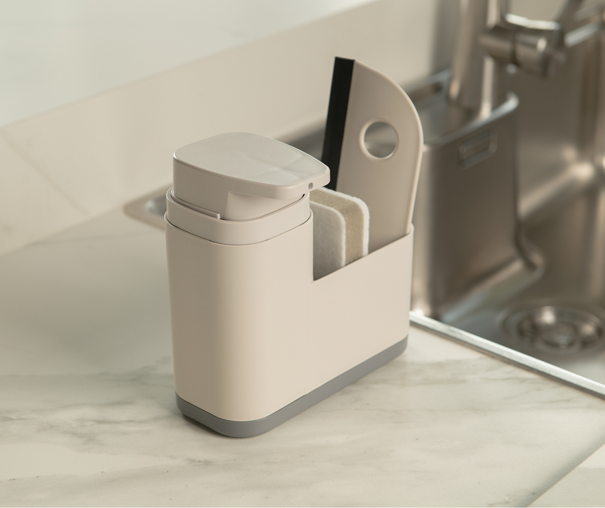 - -Versão do dispenser com compartimento multiuso para esponja, escova, rodo de pia e outros itens