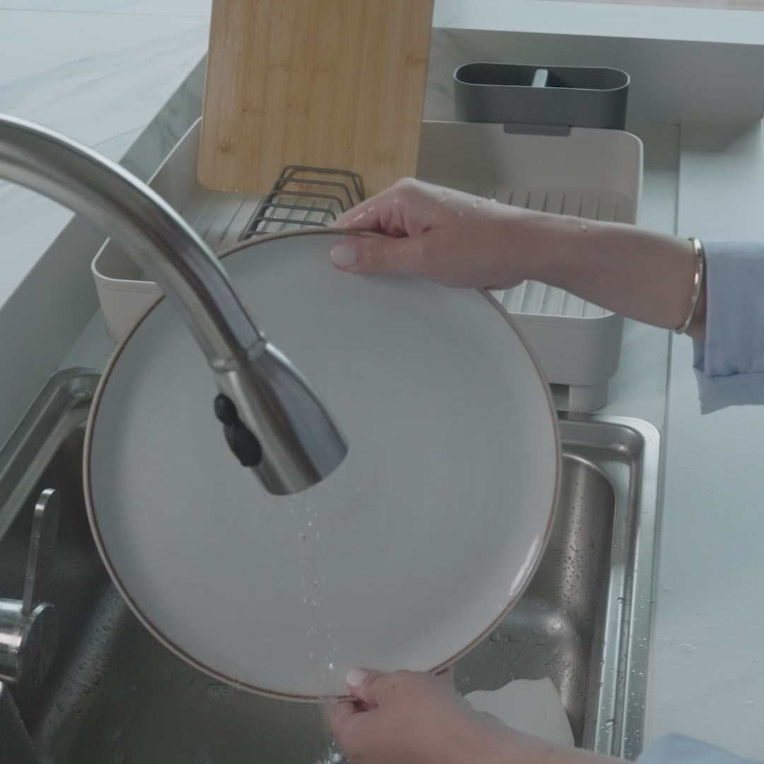 - Escorredor com direcionador de água ajustável que drena direto para a cuba -Capacidade para 12 pratos e espaço para copos, jarras e louças diversas -Design minimalista bicolor com cantos arredondados