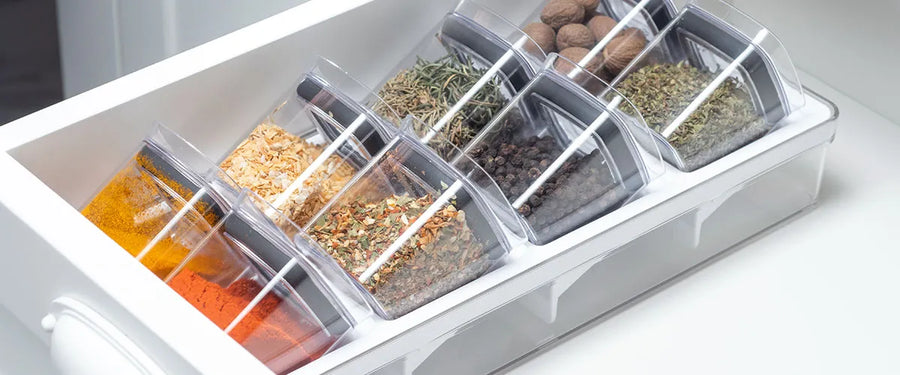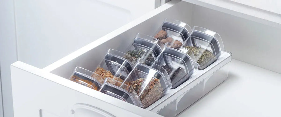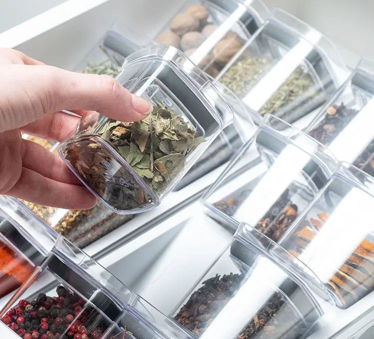 - -Inclinação de 25° que facilita a visualização e o acesso aos temperos -Capacidade para 8 potes de 150 ml, ideal para otimizar o espaço da gaveta -Produzido com materiais resistentes e transparentes, fáceis de higienizar -Design modular que permite combinações versáteis e organização eficiente