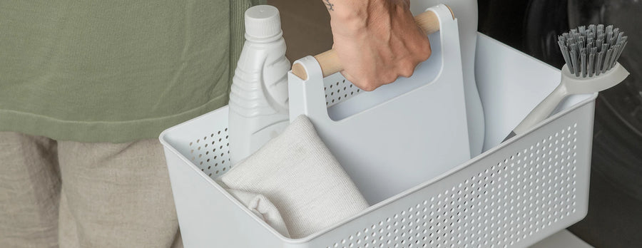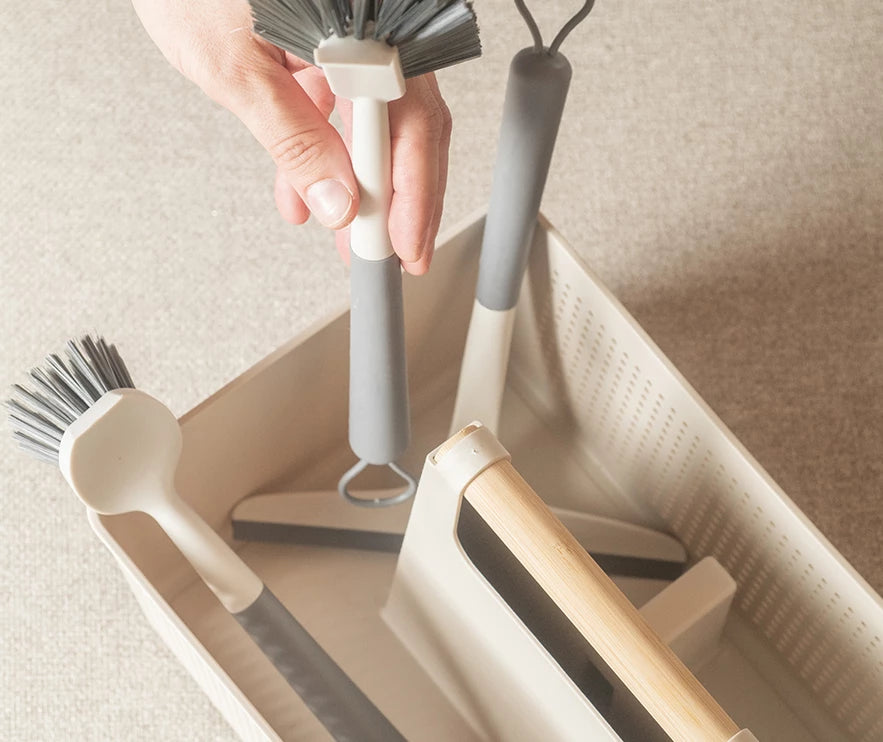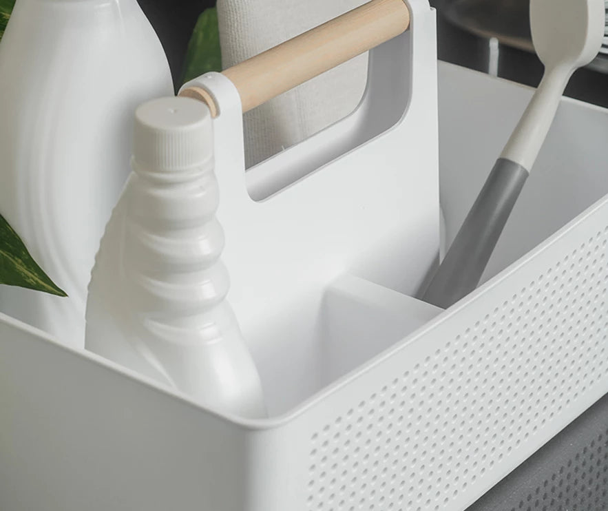 - -Divisória interna que separa os itens e evita bagunça -Alça ergonômica em bambu que garante conforto no uso -Leve seus produtos de limpeza de um cômodo a outro com facilidade -Feito em polipropileno resistente, ideal para diferentes usos na casa